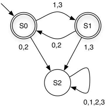 Consider the DFA over Σ = {a, b} that accepts all strings containing "aa" as a substring. It has three states: q0 (no ’a’ seen), q1 (one ’a’ seen), and q2 (accepting sink — "aa" seen).