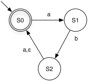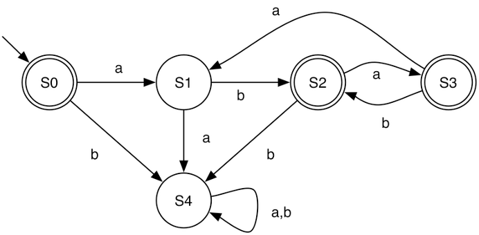 The resulting DFA accepts exactly the strings over {a, b} that do not contain "aa" — i.e., strings where no two consecutive as appear. For example, ε, b, ab, bab, and aba are accepted, while aa, baa, and aab are rejected.