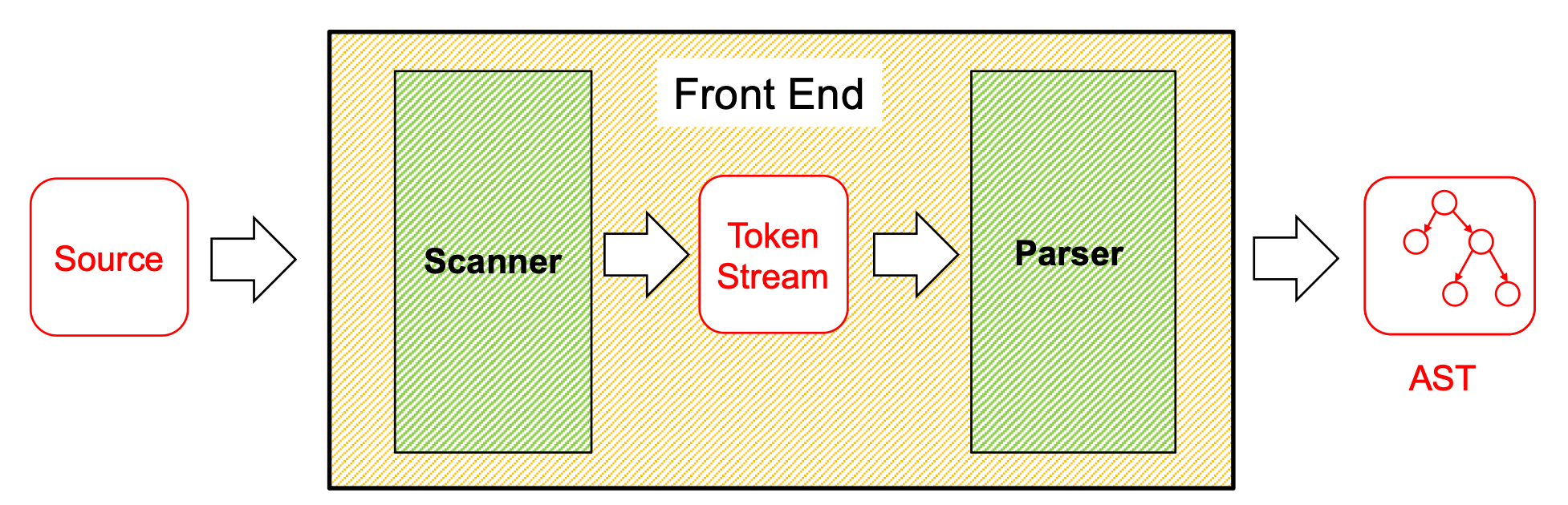 The goal of the front end is to convert program text into an Abstract Syntax Tree (AST). ASTs are easier to analyze, optimize, and execute than raw source code.