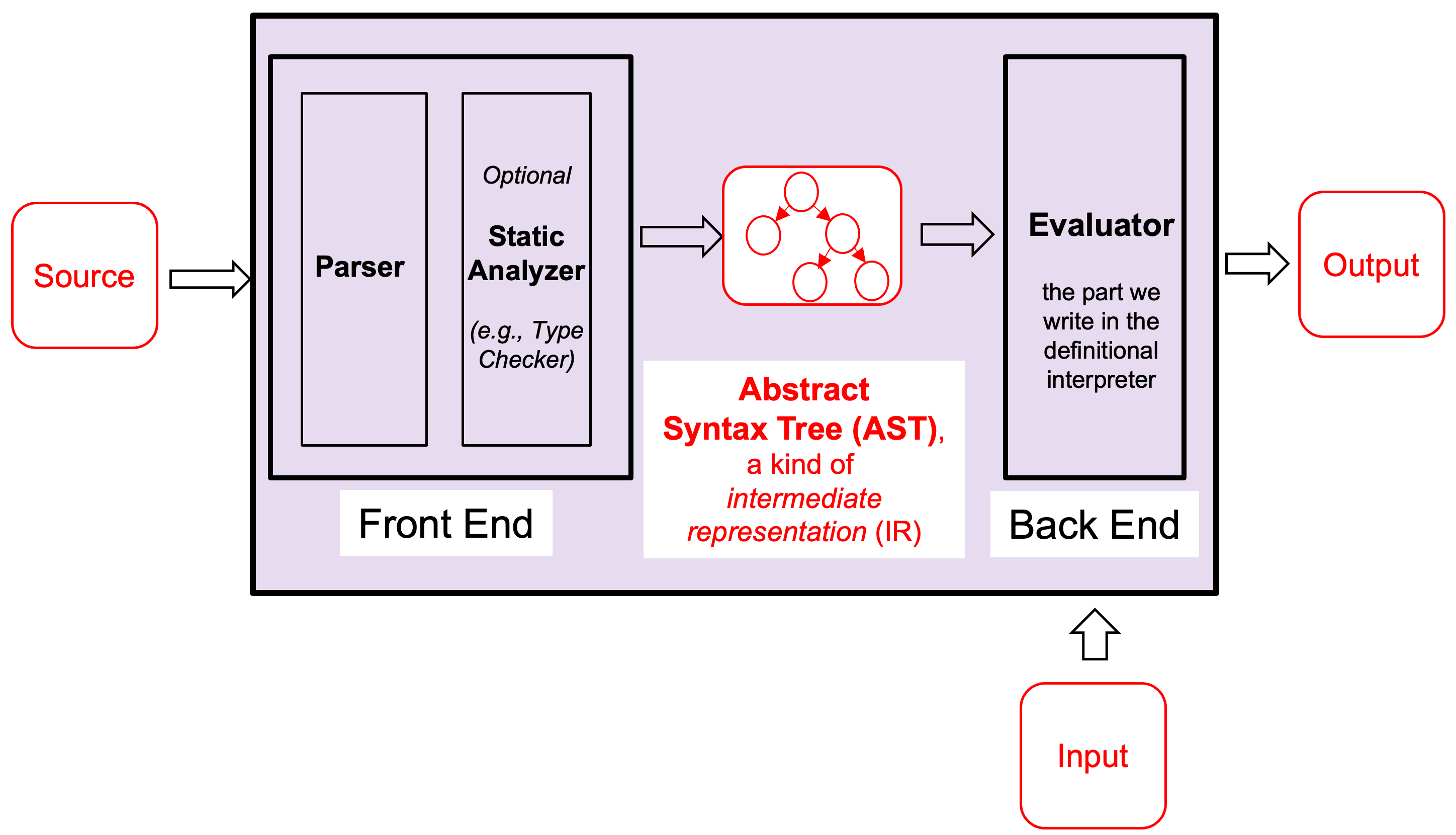 intermediate representation. The back end (Evaluator) takes the AST and produces output.