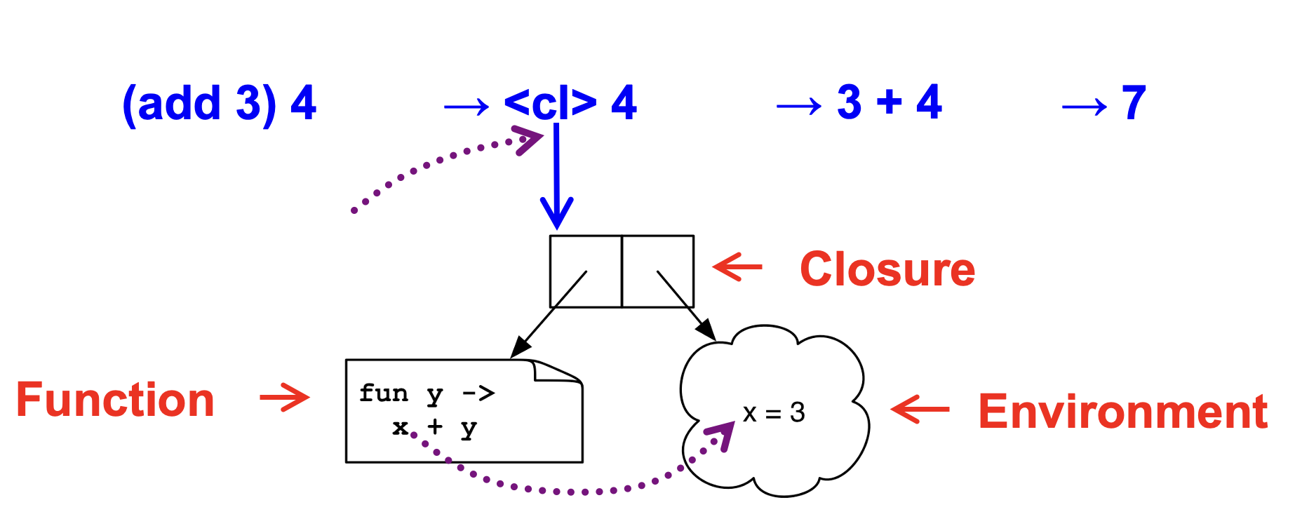 When a function is defined, OCaml createa an environment for the function. It is a mapping from variable names to values, just like a stack frame. We call function and its environment together a closure. A closure is a pair ‘(f, e)‘ consisting of function code ‘f‘ and an environment ‘e‘. When you invoke a closure, ‘f‘ is evaluated using ‘e‘ to look up variable bindings.