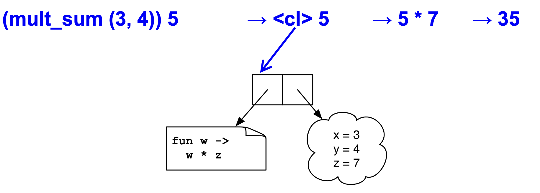 ‘mult_sum (3,4)‘ returns a closure where the function is ‘fun w -> w * z‘ and its environment contains the bindings for ‘x,y‘, and ‘z‘.